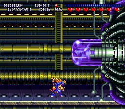 The core cycles between three attacks: the first is a torrent of wolf-shaped fireballs, which must be destroyed before they reach Sparkster. The second is a thin laser beam, which does not reach Sparkster on the ground but deters him from approaching. The third, which is introduced when the Core is close to defeat, is a barrage of bombs dropped from above.